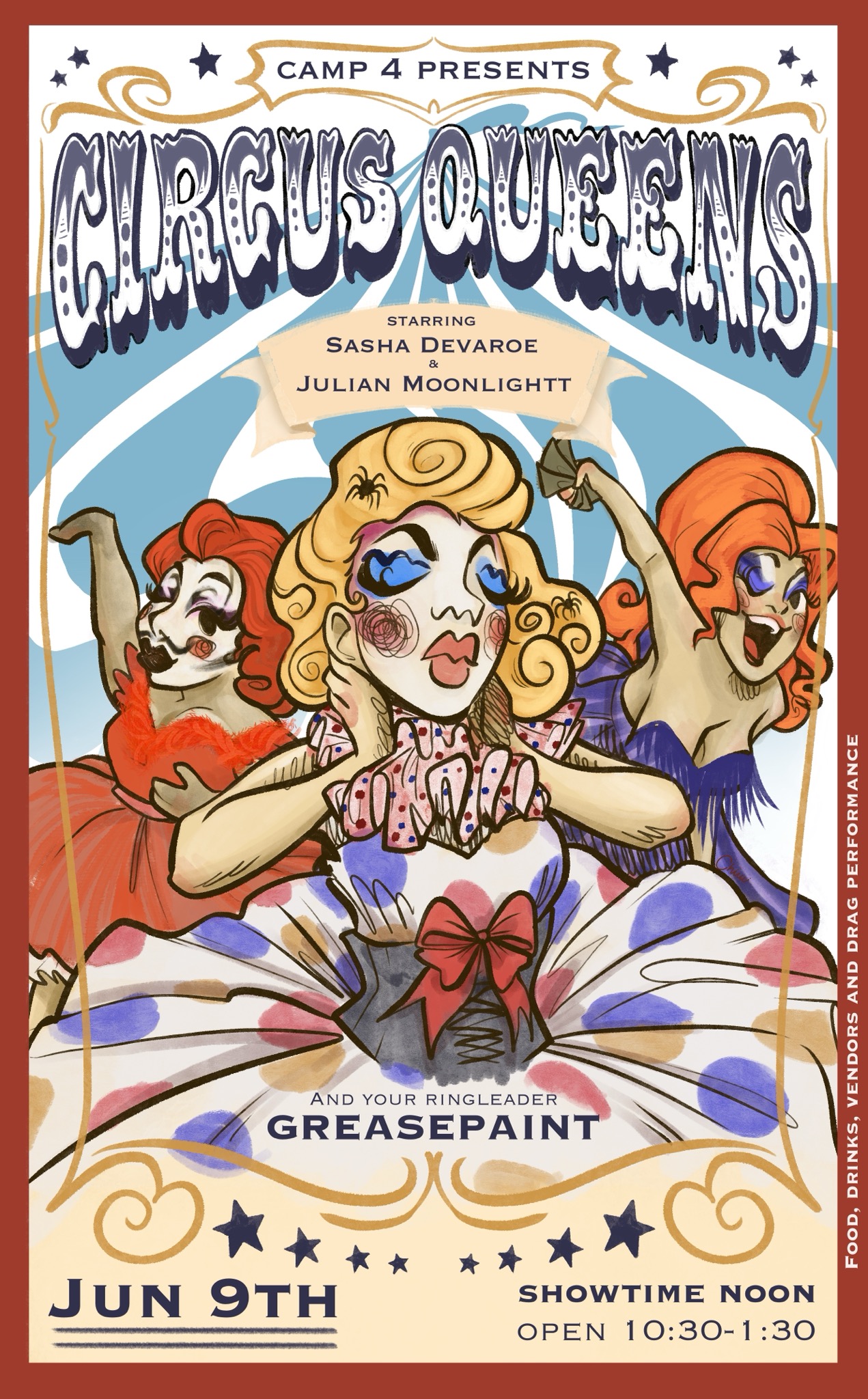 camp 4 is hosting it's first drag brunch to show our support of pride!! please join us for art vendors, snacks, drinks and performances from your local drag favorites! our drag artists will be sasha devaroe who was voted best drag in moesto by the moma awards, the central valleys favorite ghoul julian moonlight and our very own chef and local glamour clown, greasepaint!!